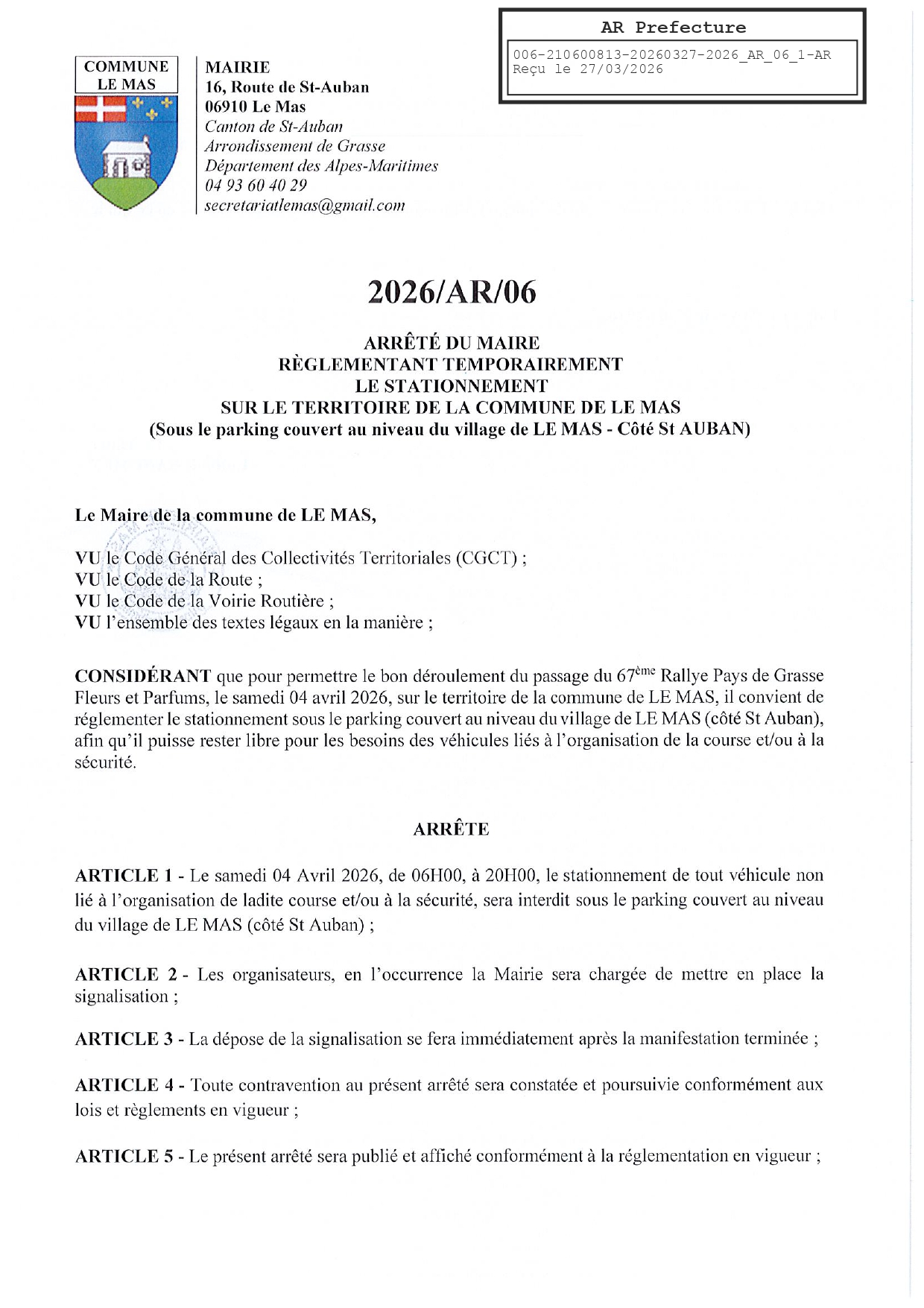 Samedi 04 Avril 2026 de 06h00 à 20h00, le stationnement de tout véhicule non lié à l’organisation du 67ème Rallye de Grasse et/ou à la sécurité, sera interdit sous le parking couvert au niveau du village de LE MAS (côté St Auban).