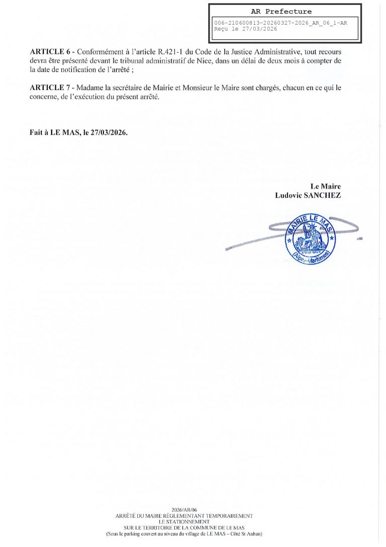 Le Mas » Actualités » Arrêté Municipal N°2026/AR/06
