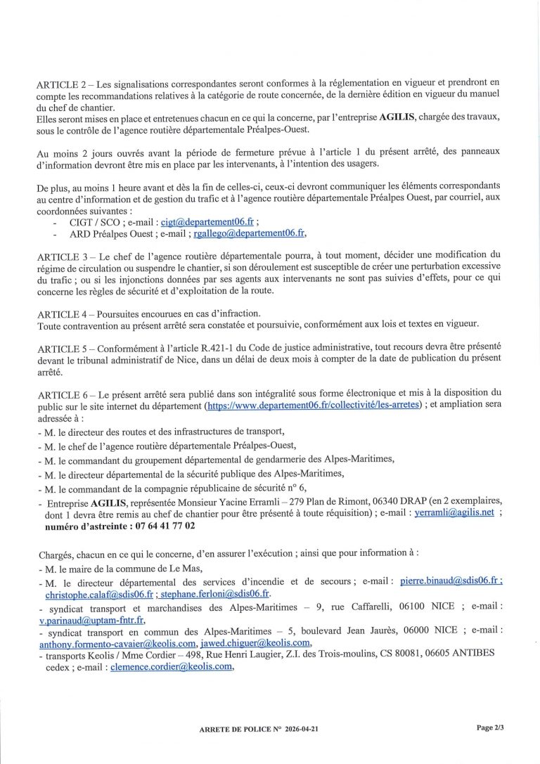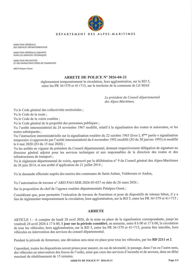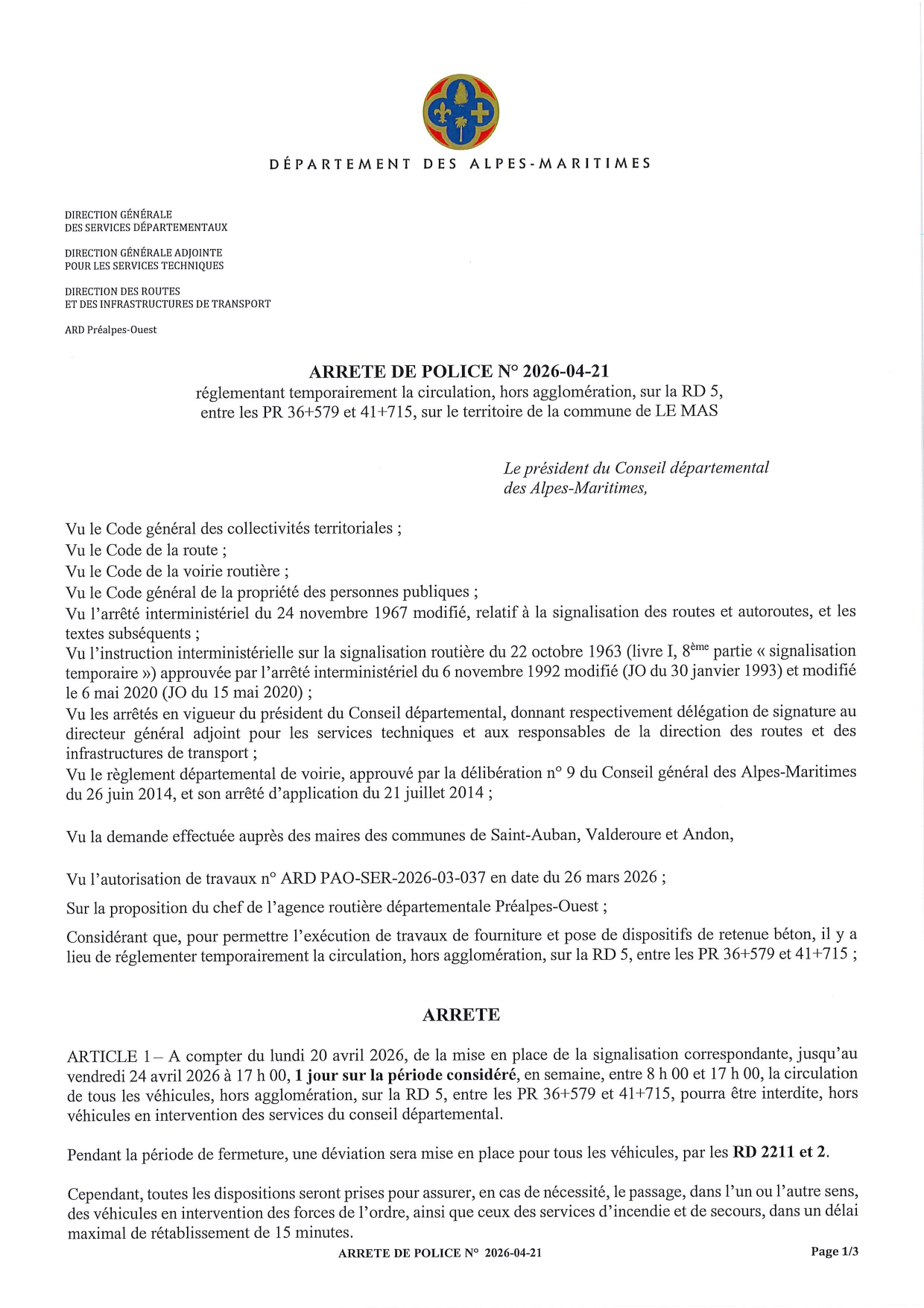 Arrêté de police temporaire N° 2026-04-21, réglementant, du 20 au 24 avril 2026, la circulation, hors agglomération, sur la RD 5, entre les PR 36+759 et 41+715, pour l’exécution par l’entreprise AGILIS, de pose de dispositifs de retenue béton, sur le territoire de la commune de LE MAS.