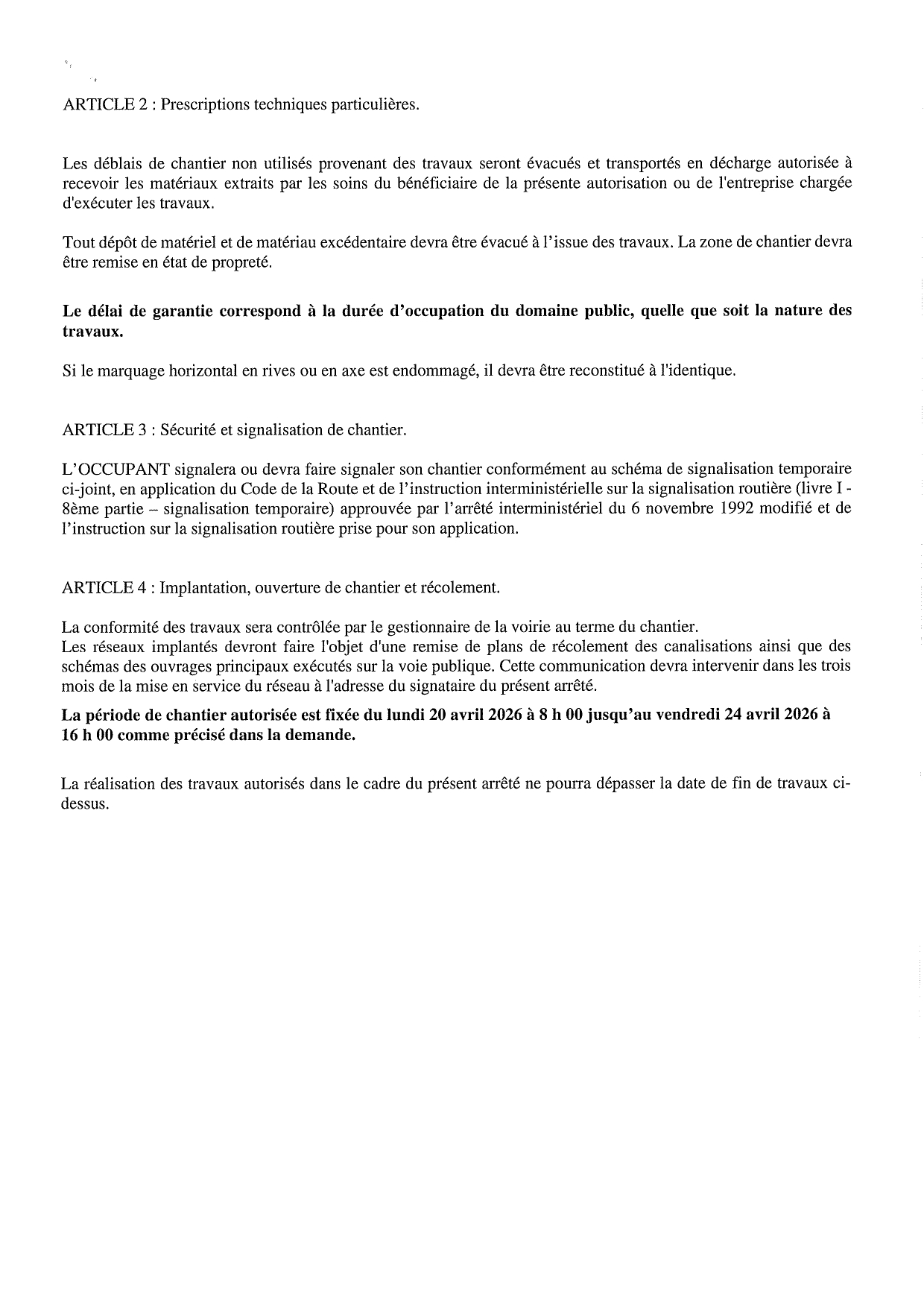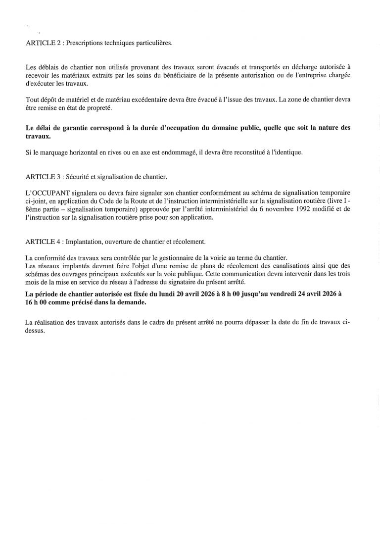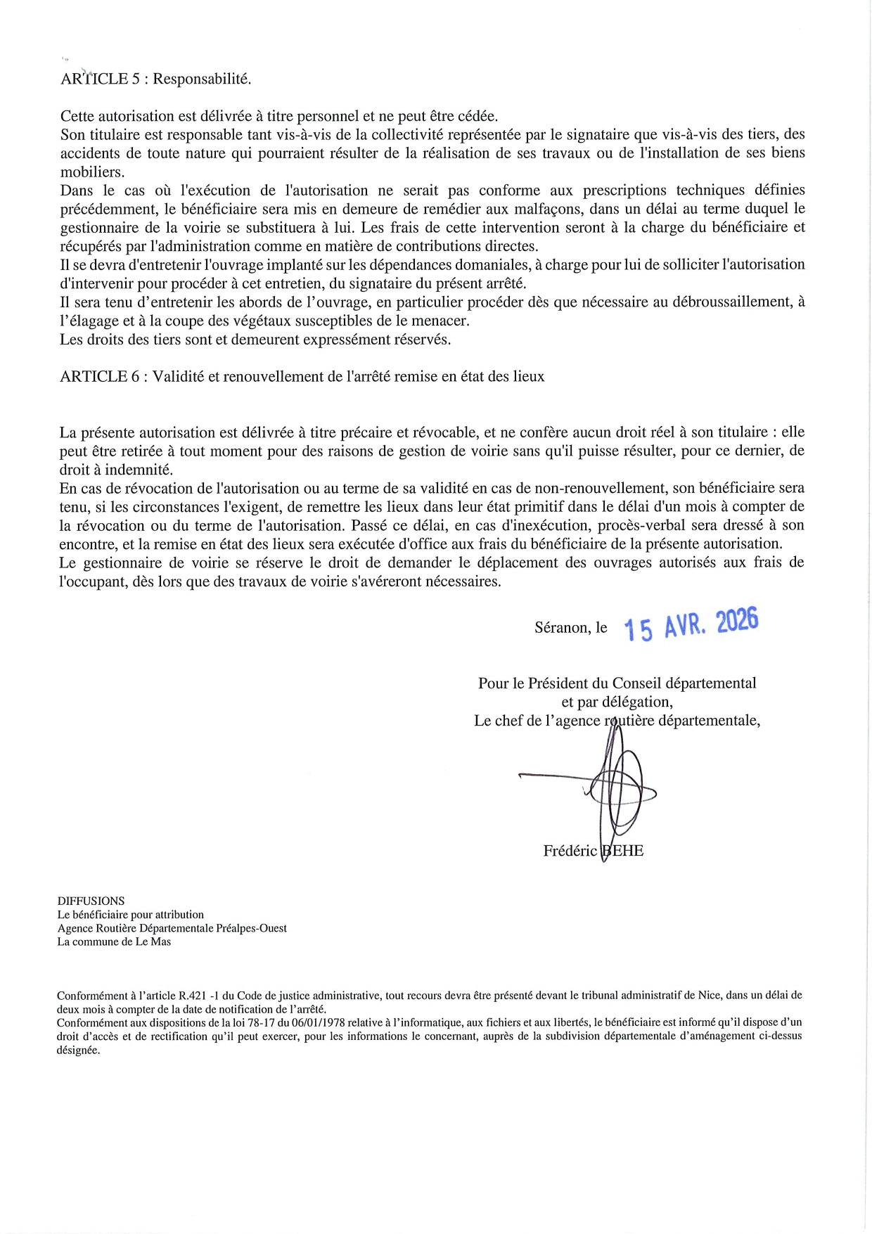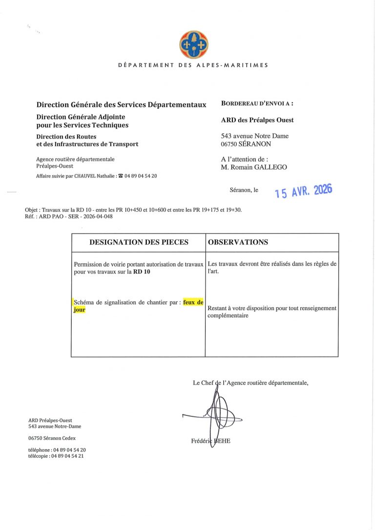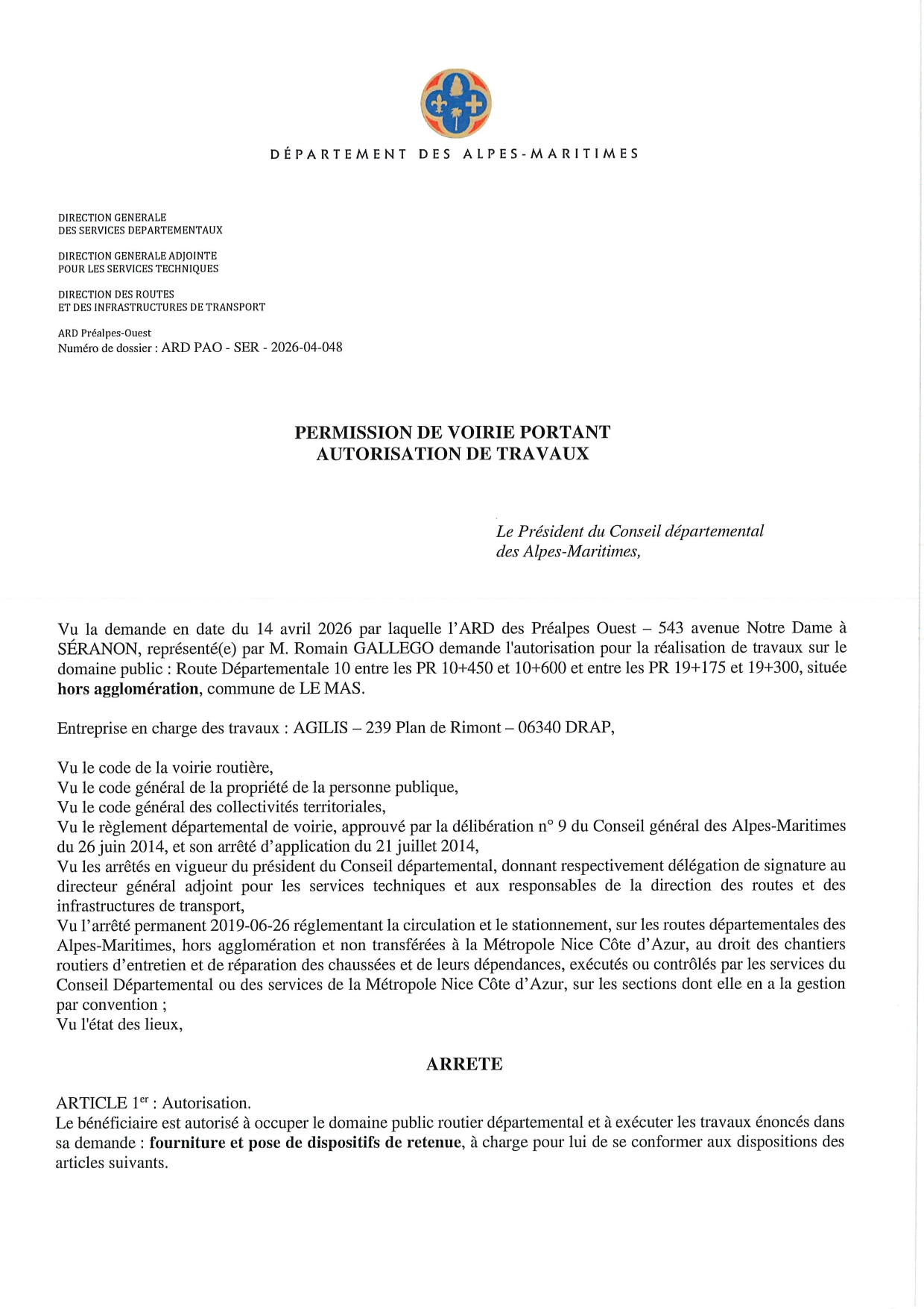Permission de voirie concernant des travaux de fourniture et de pose de dispositifs de retenue en béton hors agglomération, sur la RD 10, entre les PR 10+450 et 10+600 et entre les PR 19+175 et 19+300 – commune de LE MAS du 20 au 24 avril 2026. Ces travaux seront effectués par la société AGILIS pour le compte du Département06 et seront couverts par l’arrêté permanent chantiers routiers d’entretien et de réparation des chaussées et de leurs dépendances du Conseil Départemental 06.